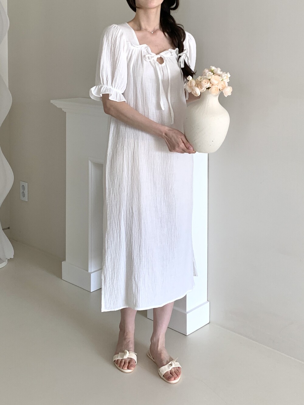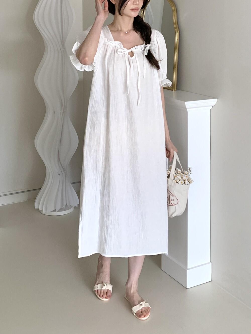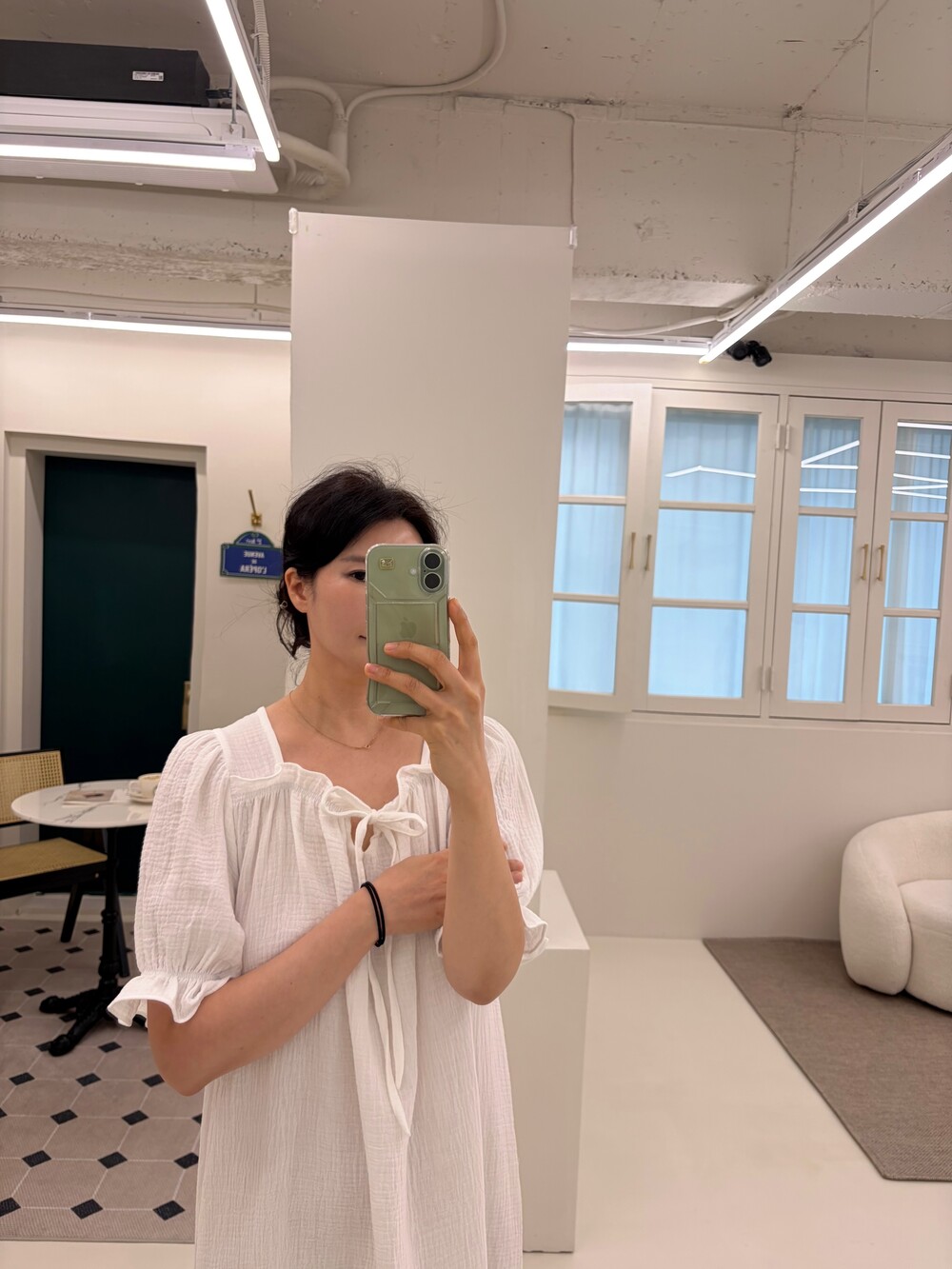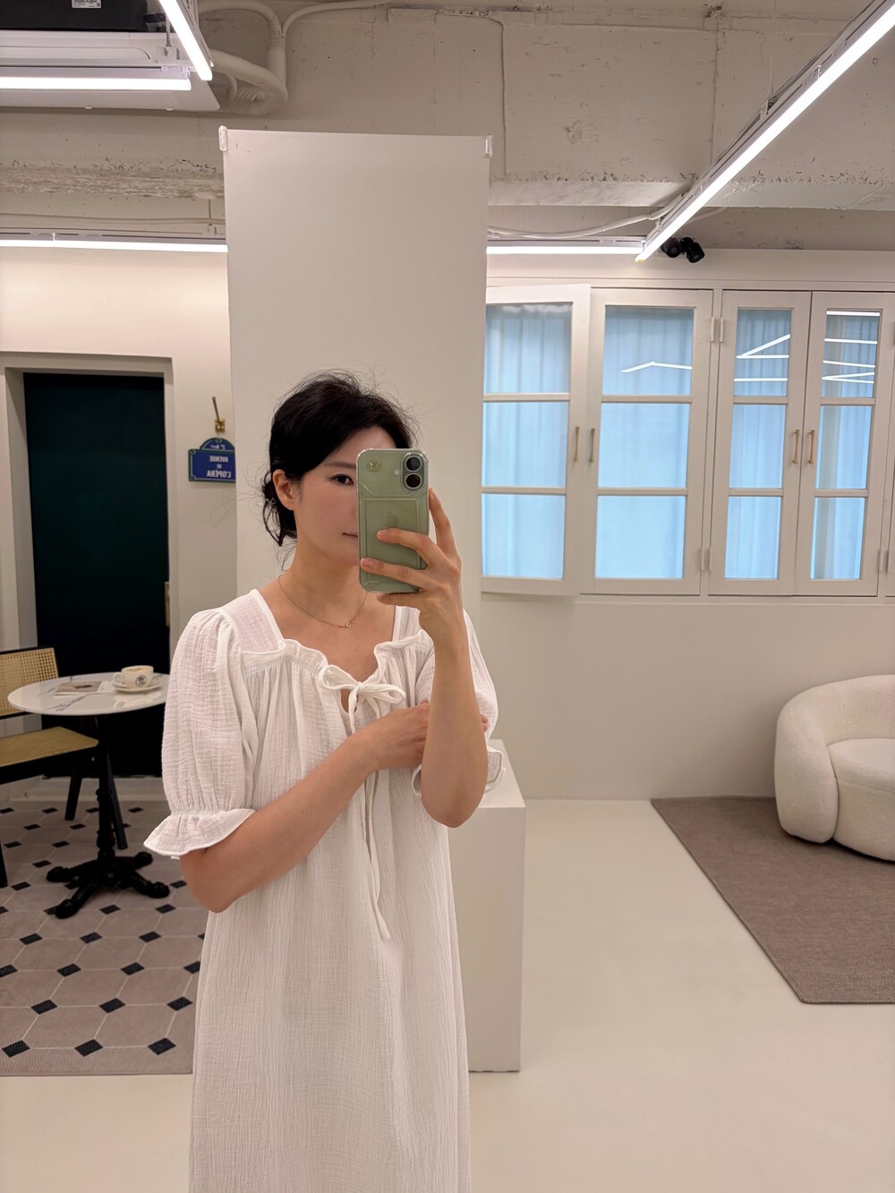 넥라인 리본 디테일과 소매 프릴 포인트는 과하지 않게 은은한 여성스러움을 더해주고,