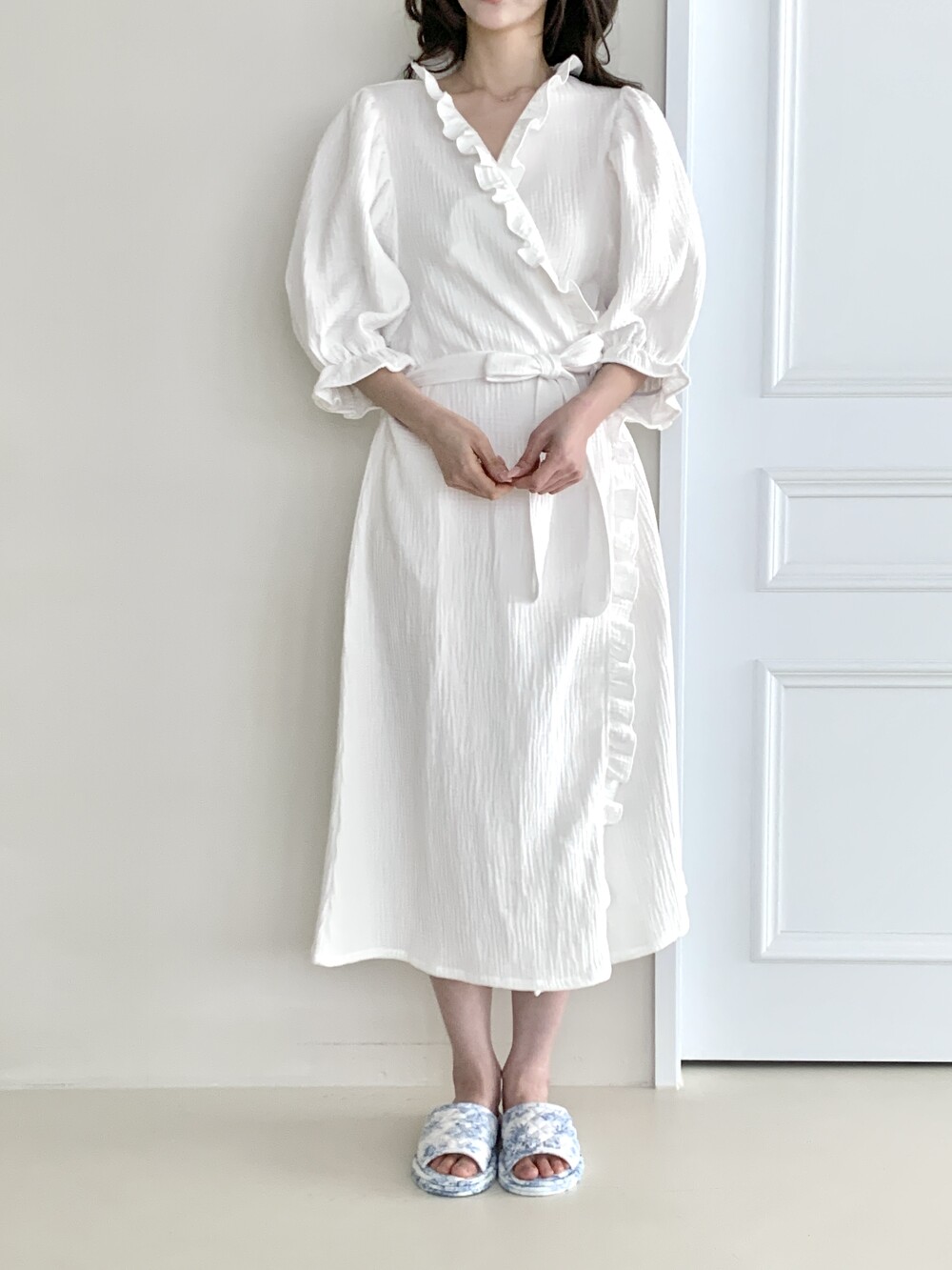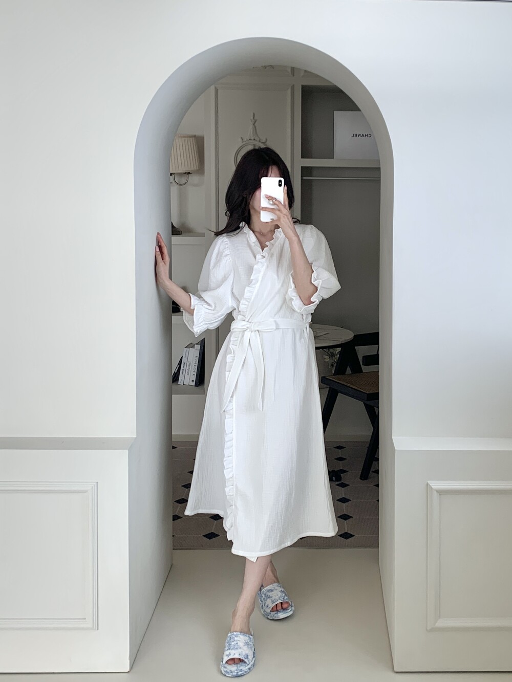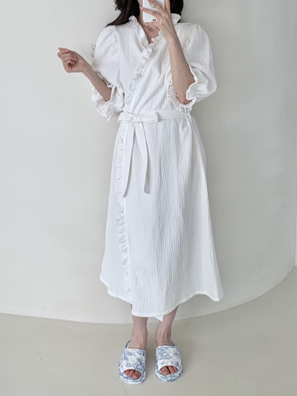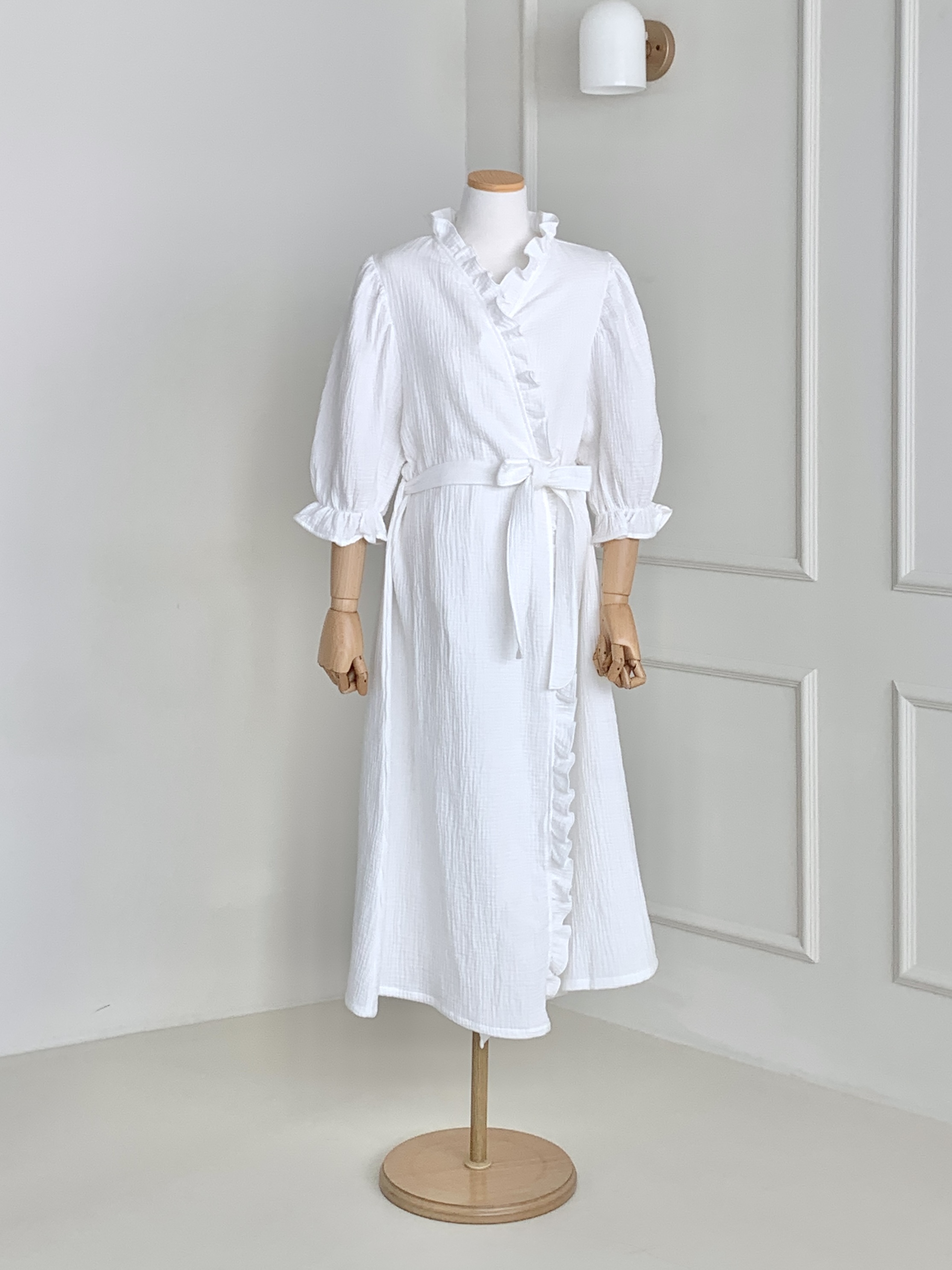 프렌치 감성의 프릴을 네크라인부터 로브 하단까지 더해 사랑스러운 분위기를 연출했습니다.