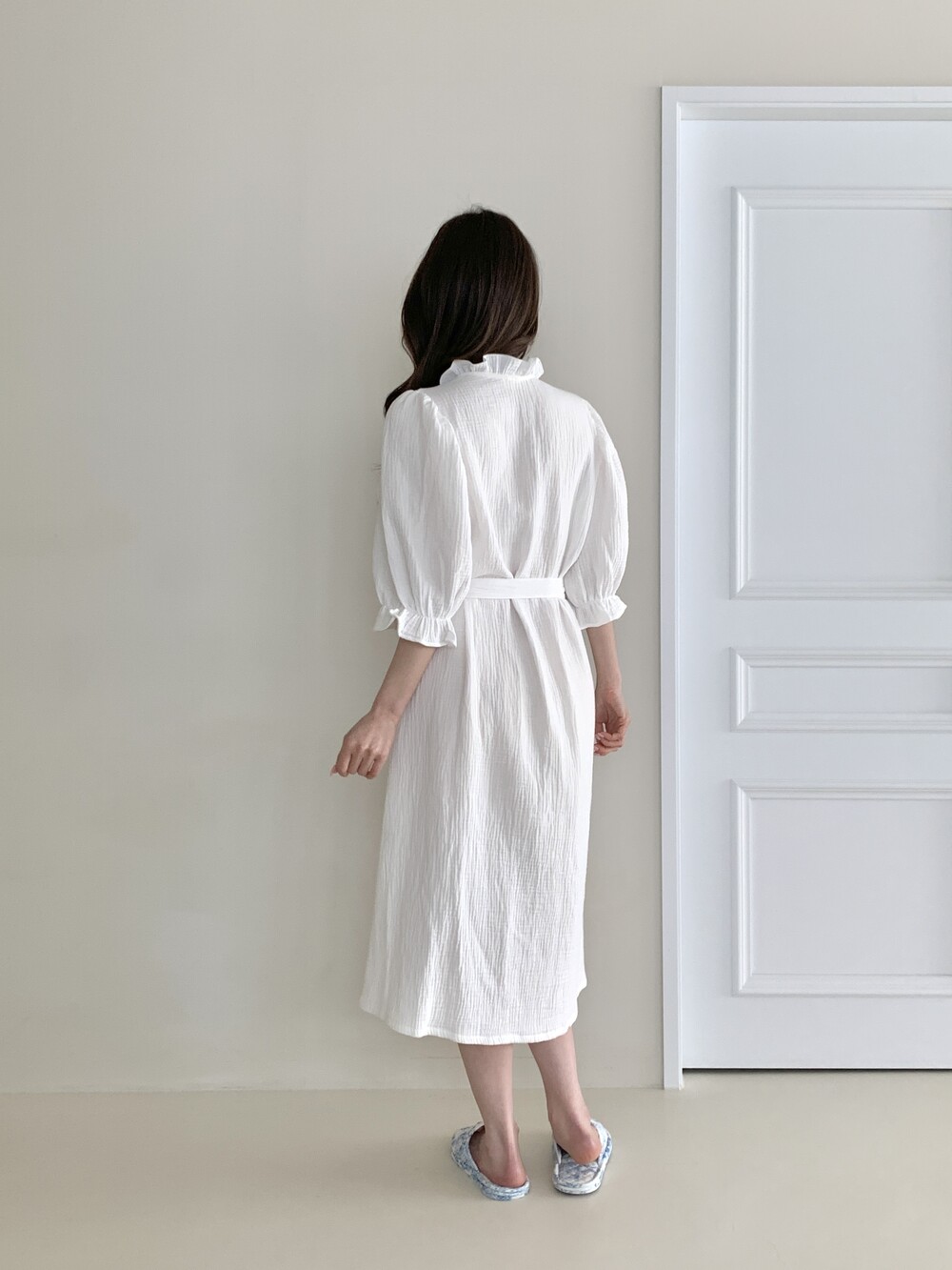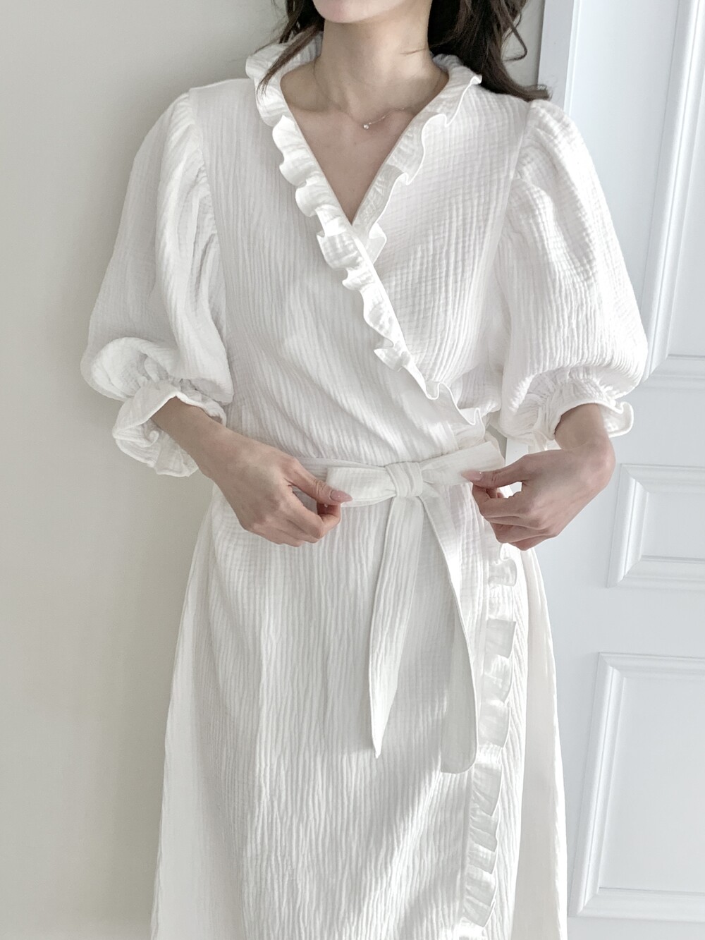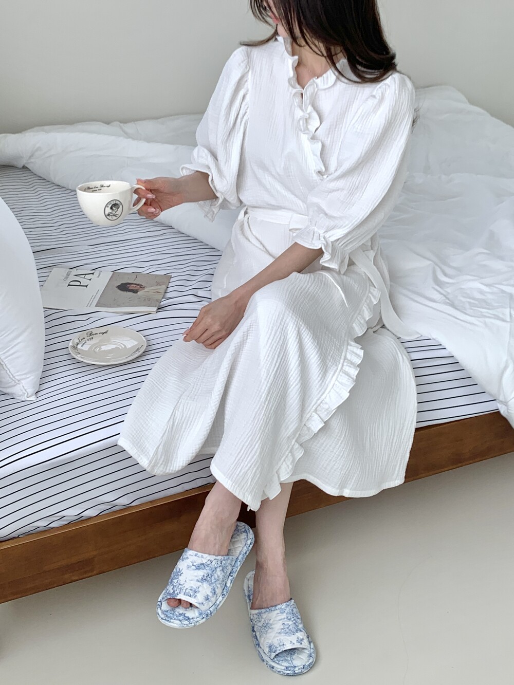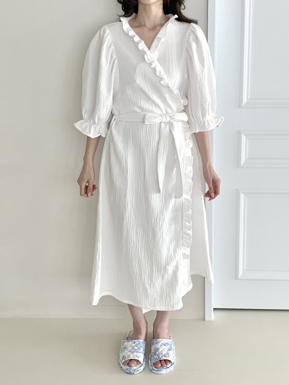 프렌치 감성의 프릴을 네크라인부터 로브 하단까지 더해 사랑스러운 분위기를 연출했습니다.