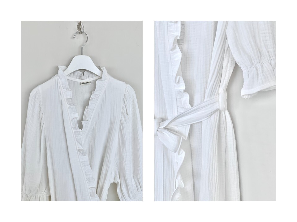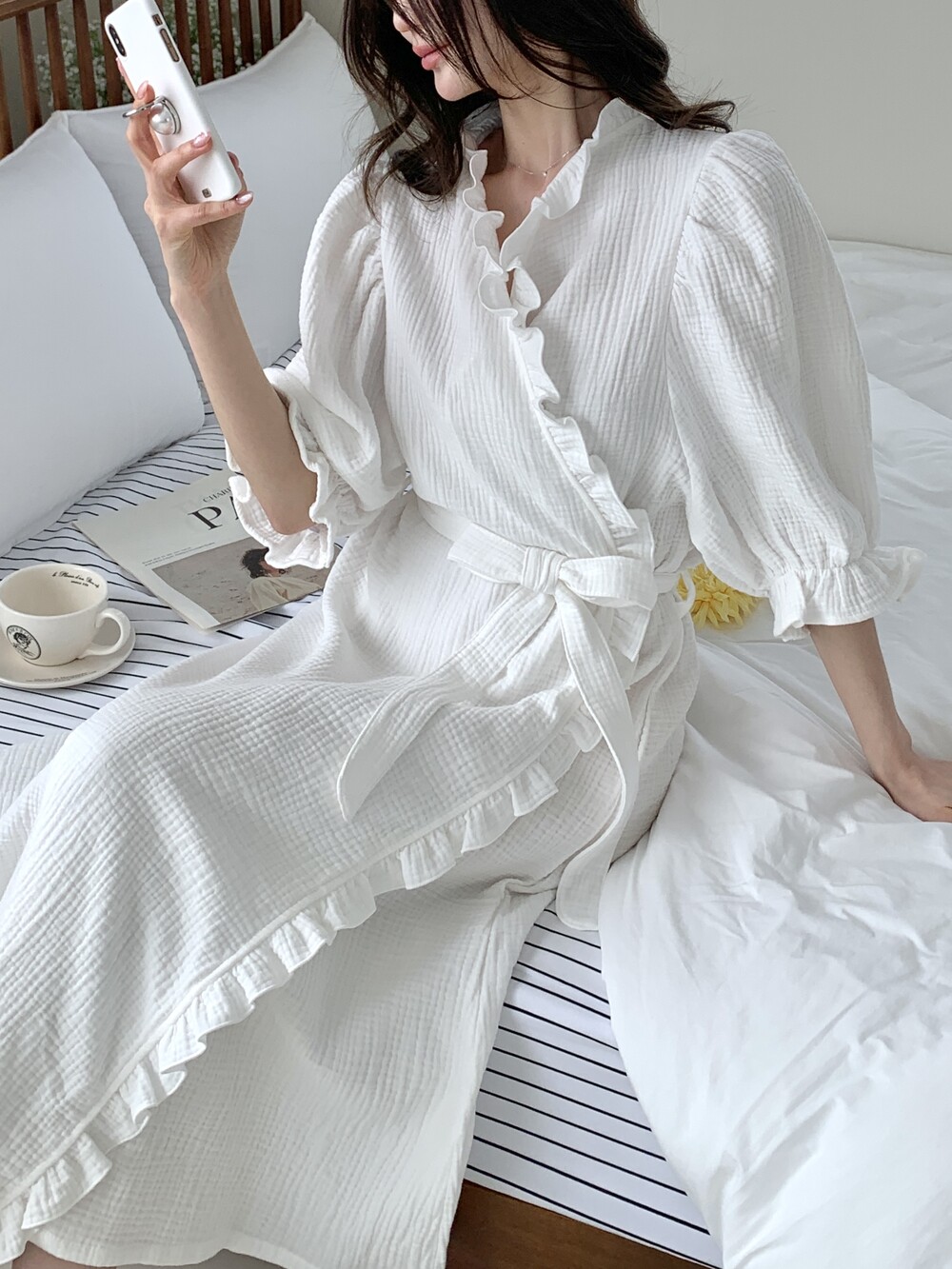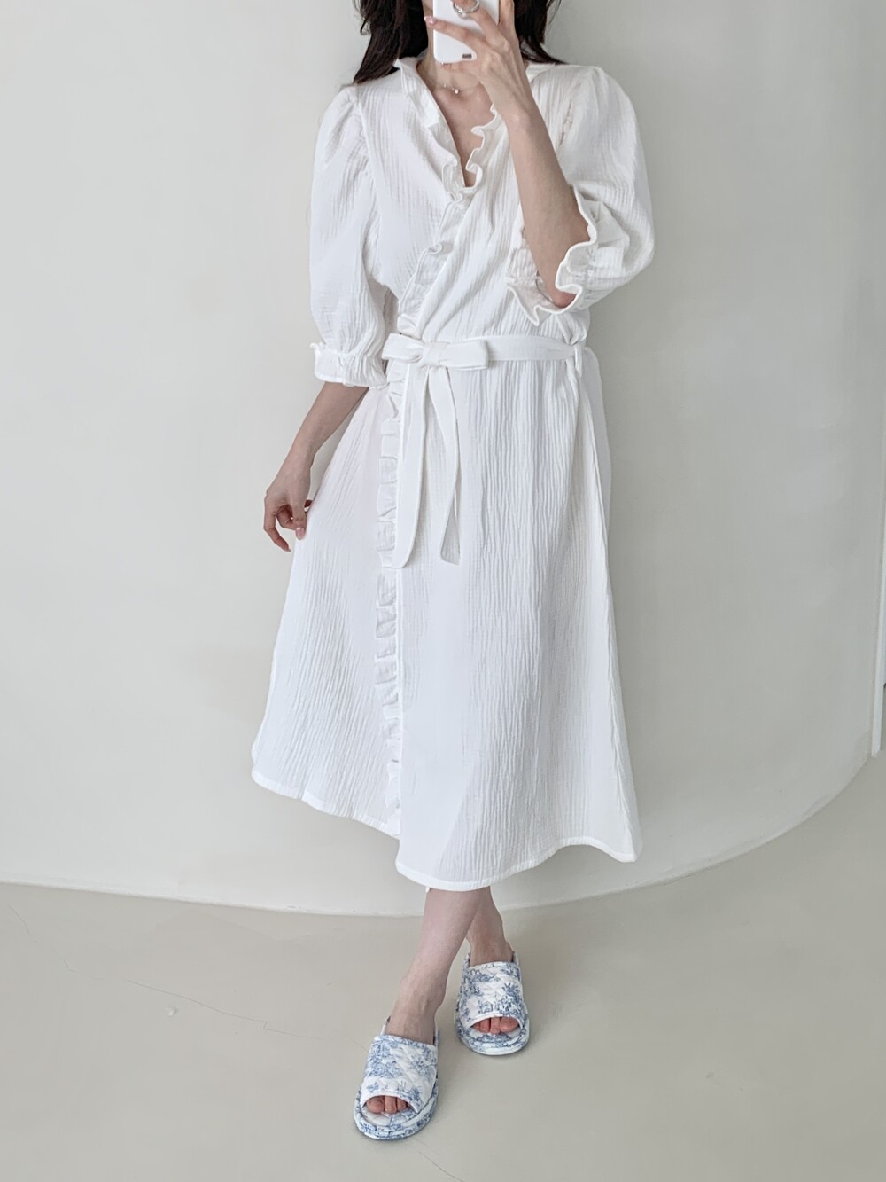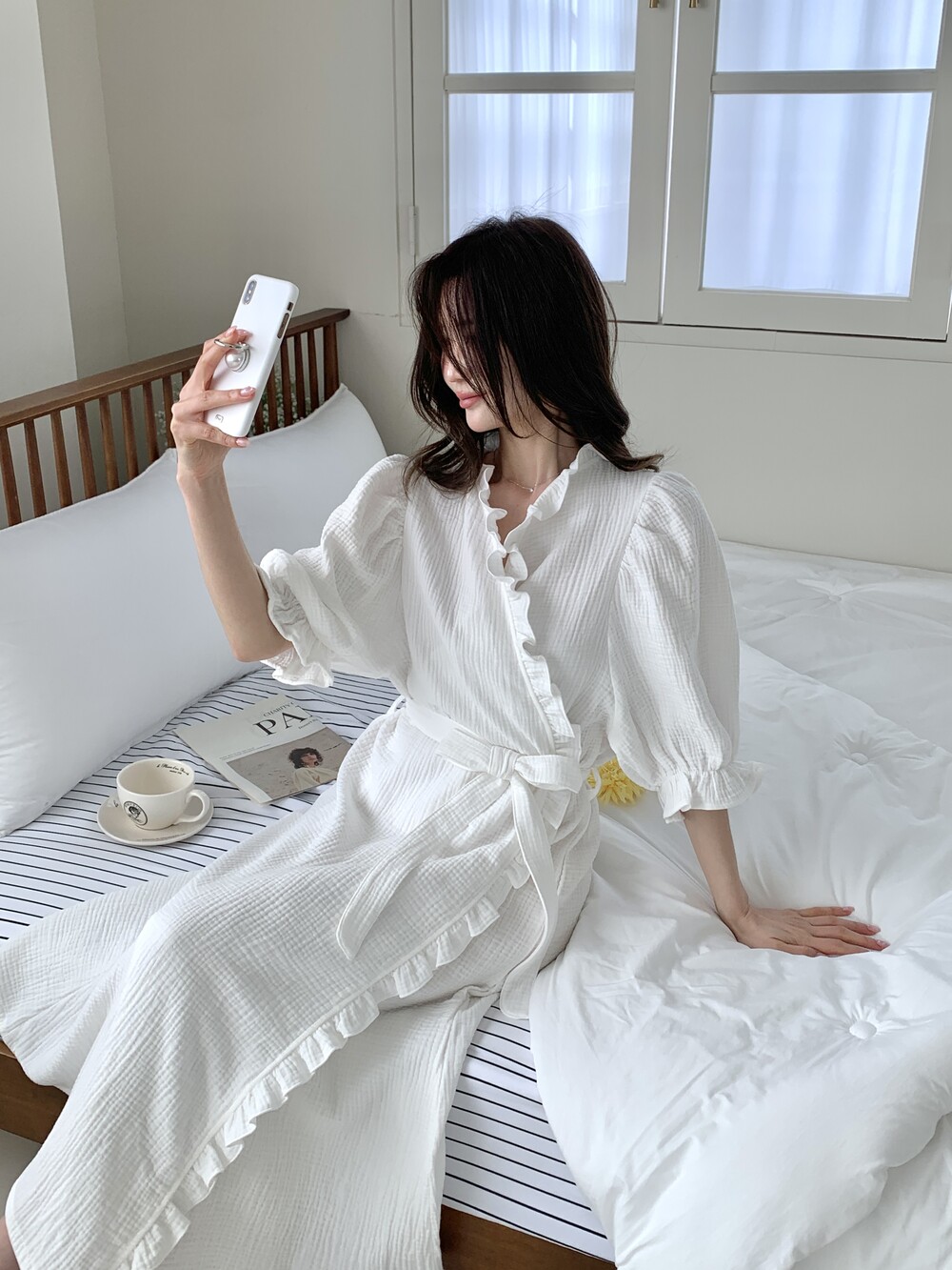 프렌치 감성의 프릴을 네크라인부터 로브 하단까지 더해 사랑스러운 분위기를 연출했습니다.