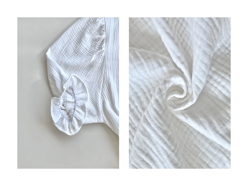 소매는 5부 볼륨소매로 여성스러움을 극대화 했고 소매 끝단의 셔링을 잡아 한번 더 프릴처리를 함으로써