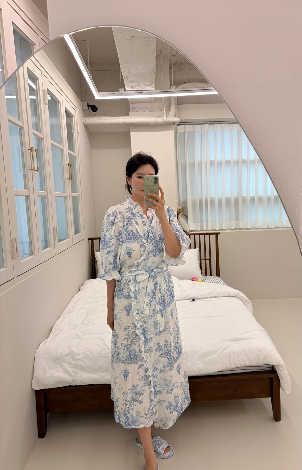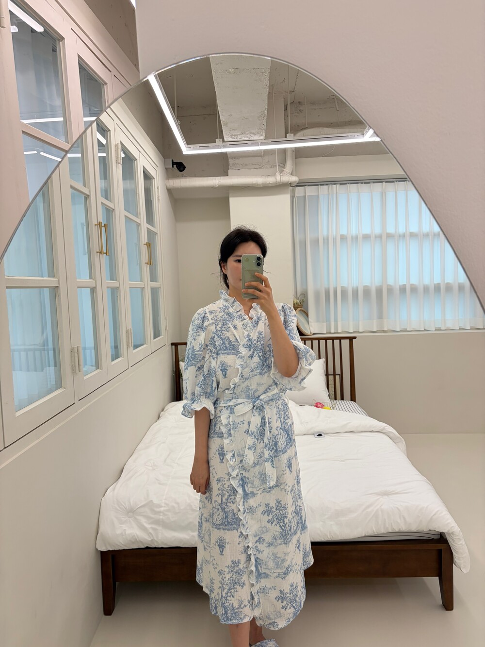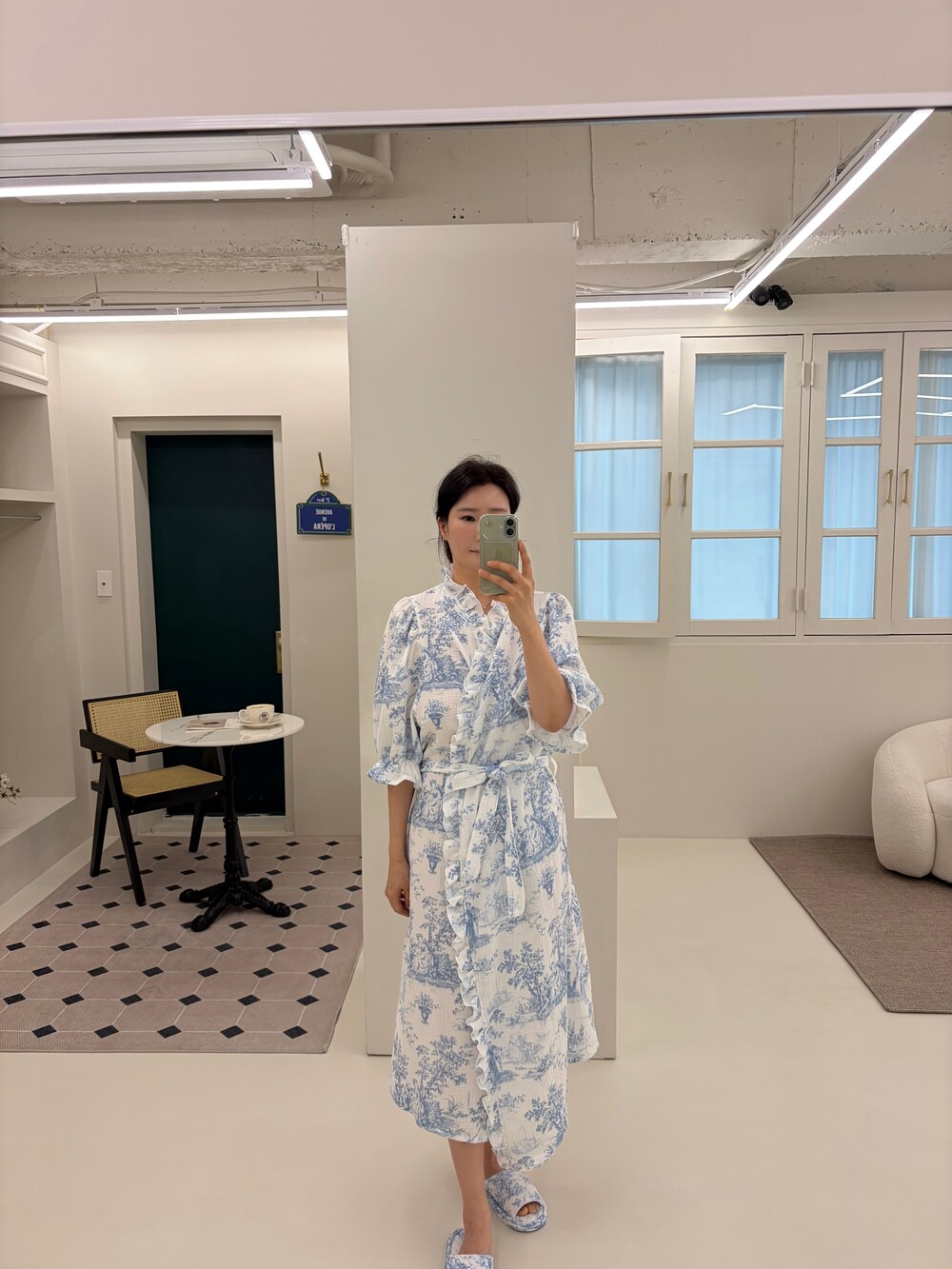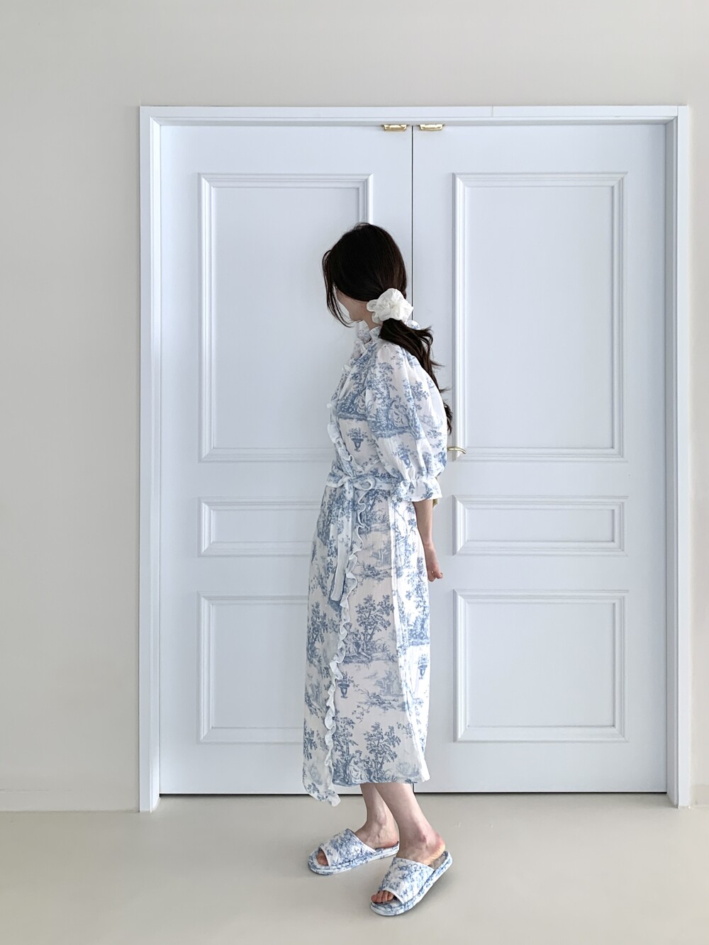 프렌치 감성의 프릴을 네크라인부터 로브 하단까지 더해 사랑스러운 분위기를 연출했습니다.