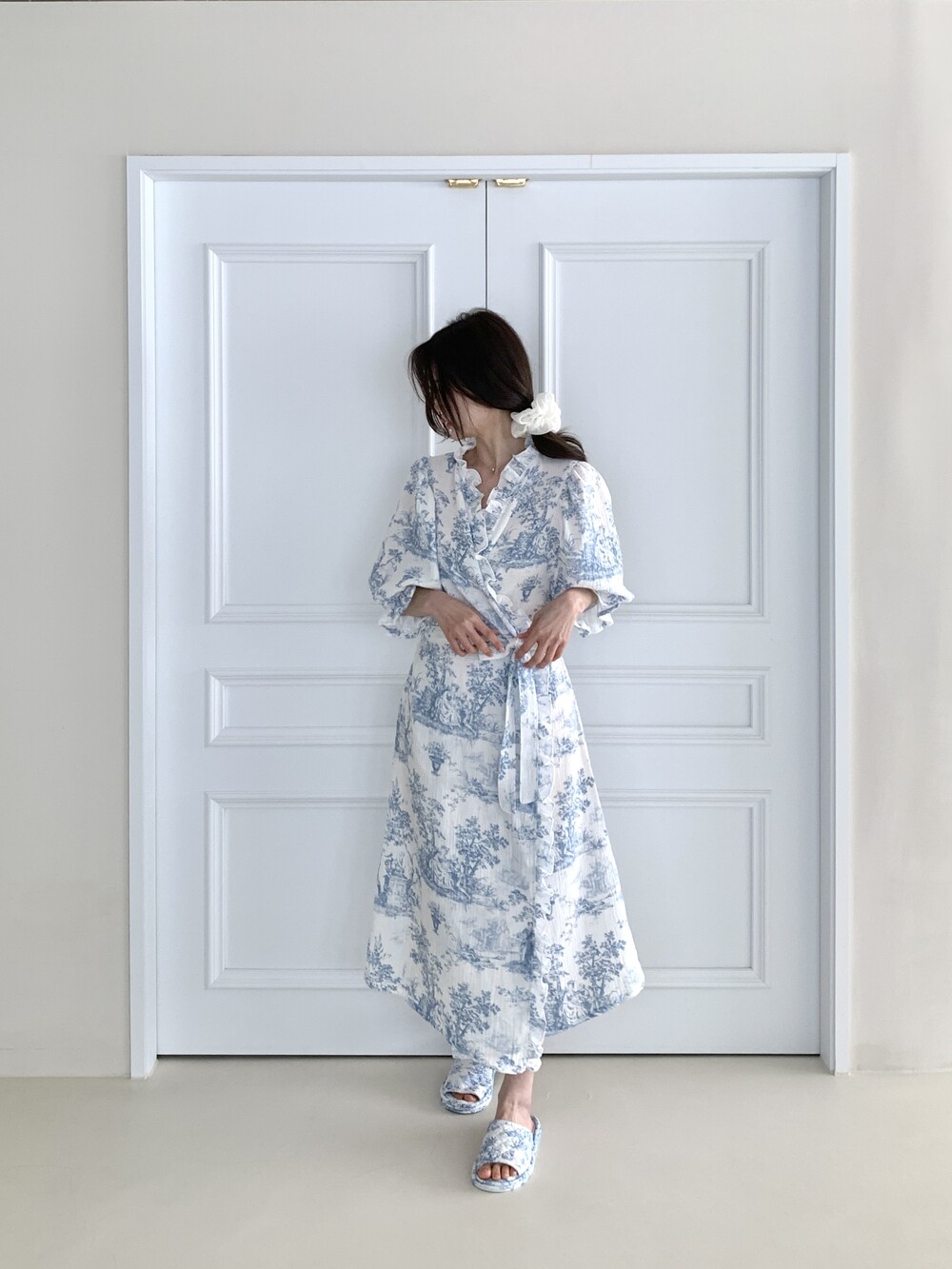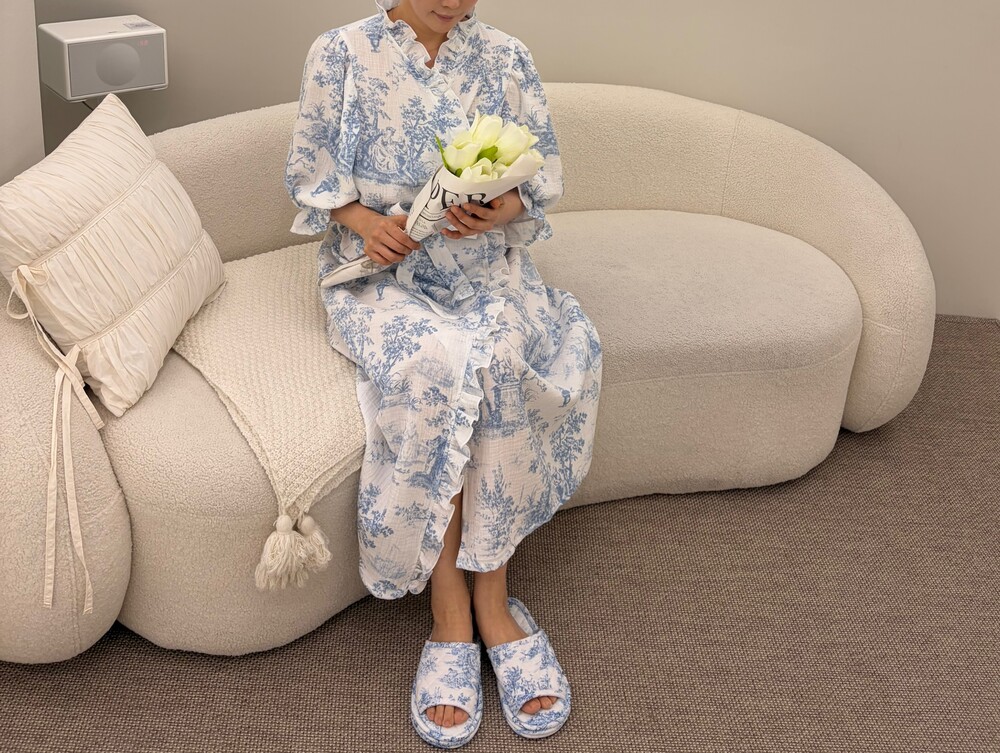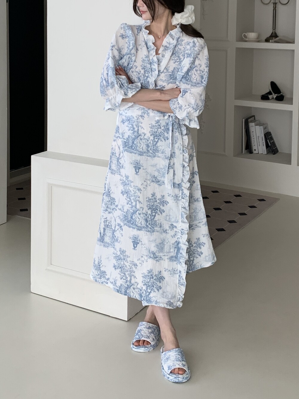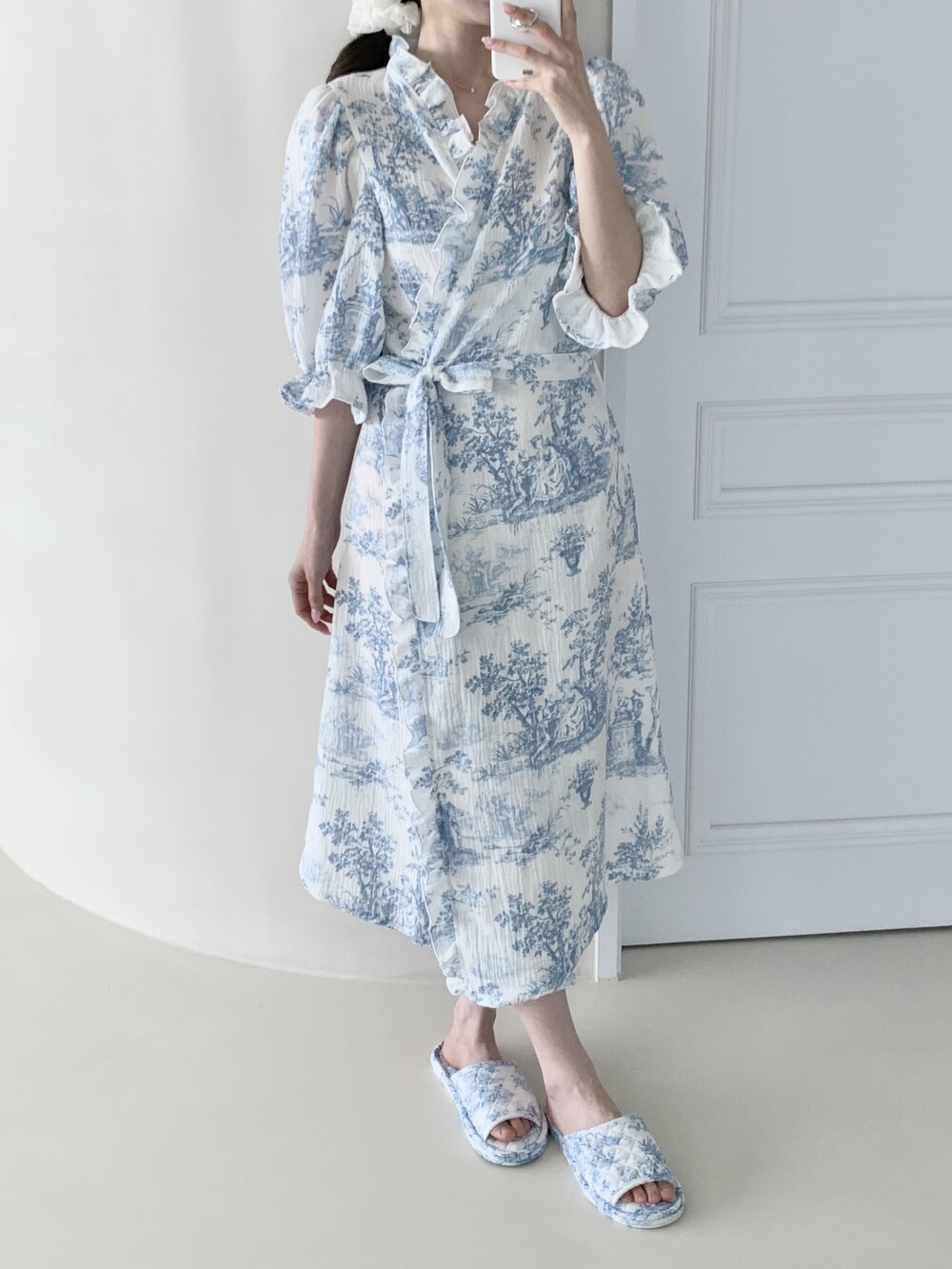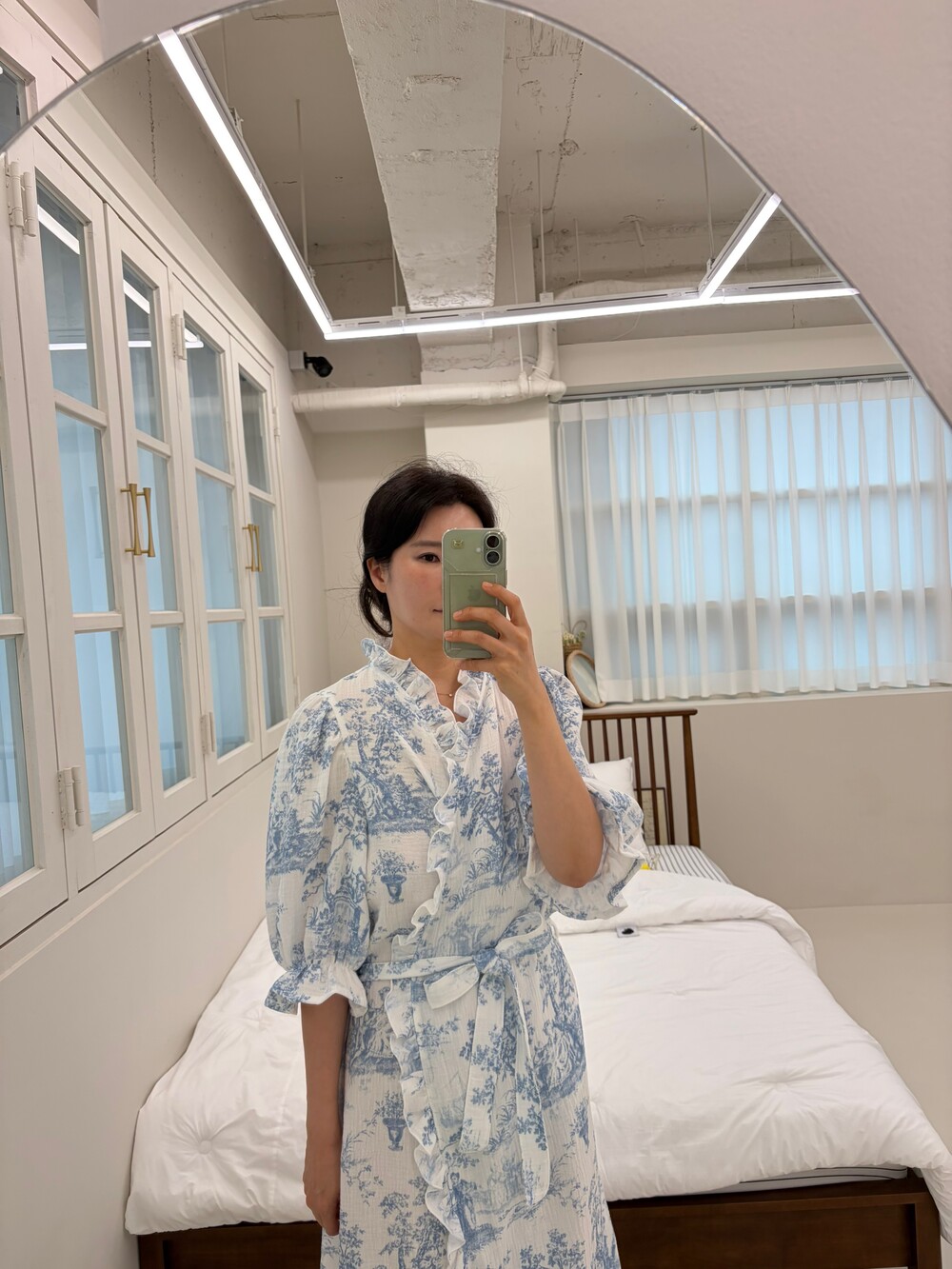 프렌치 감성의 프릴을 네크라인부터 로브 하단까지 더해 사랑스러운 분위기를 연출했습니다.