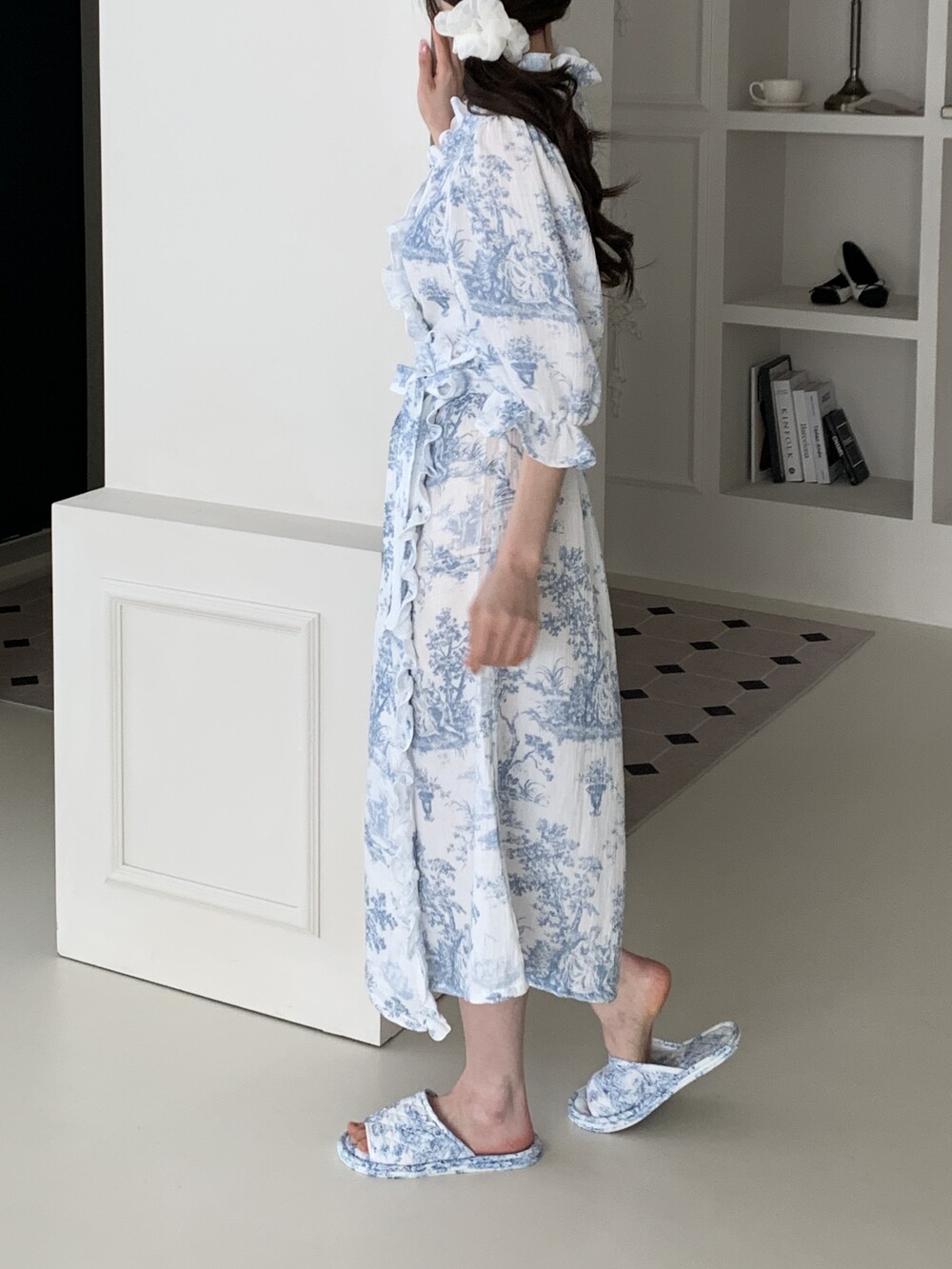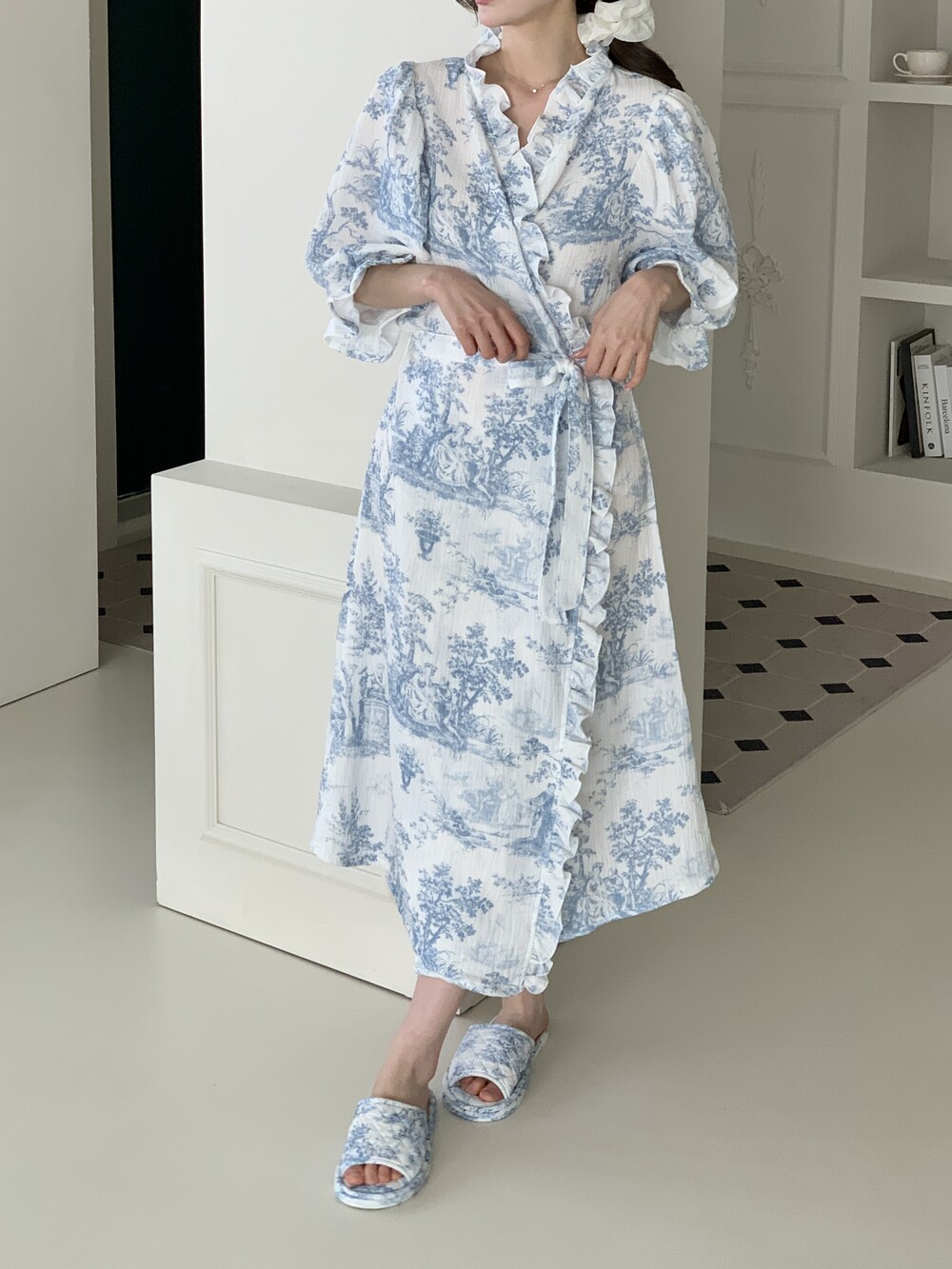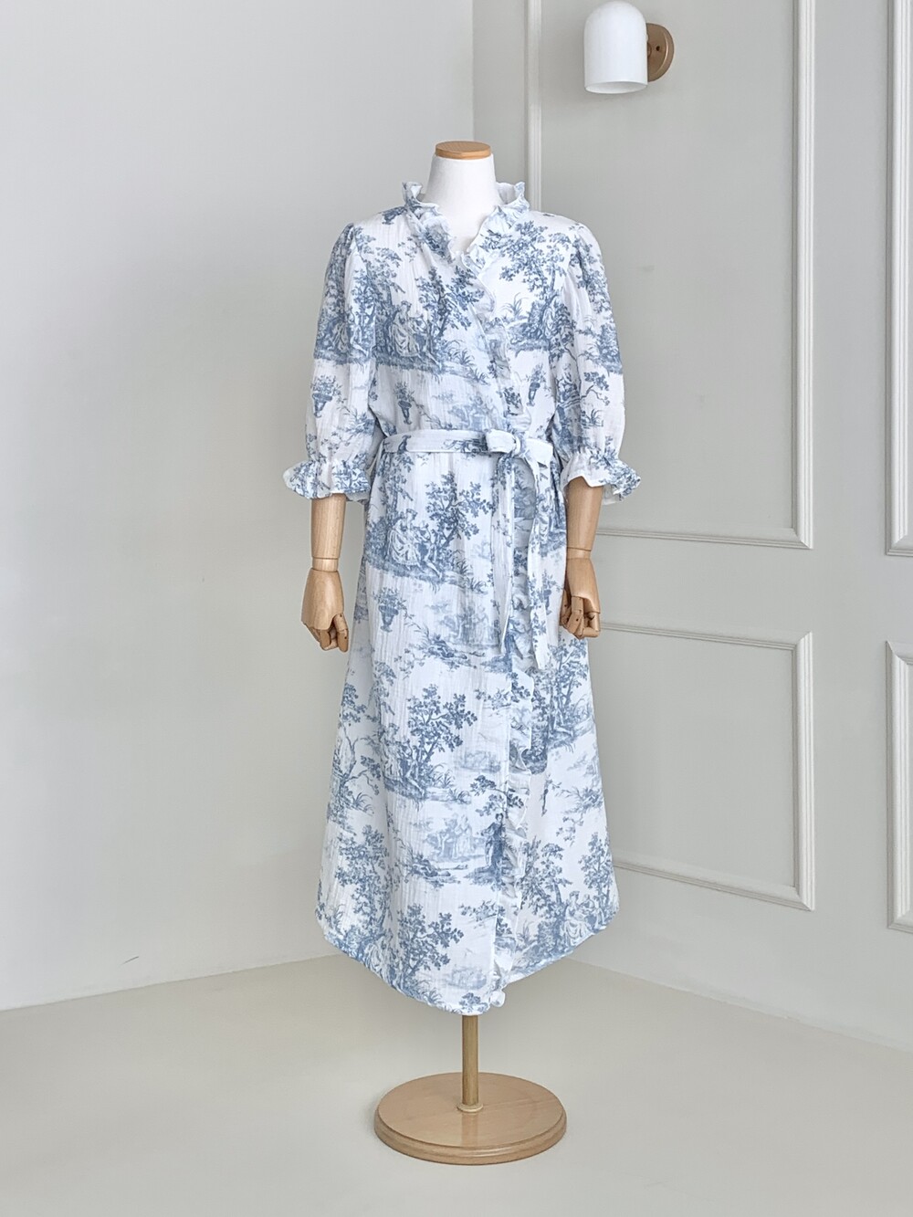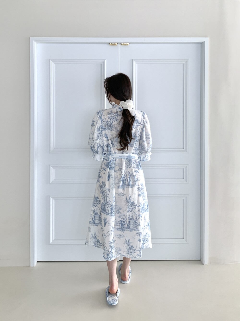 프렌치 감성의 프릴을 네크라인부터 로브 하단까지 더해 사랑스러운 분위기를 연출했습니다.