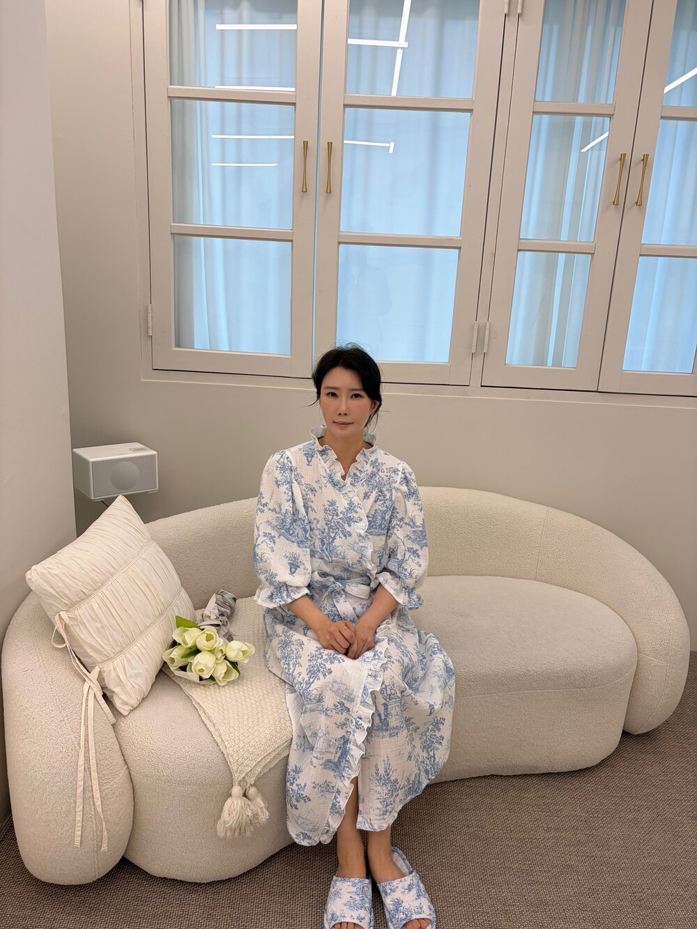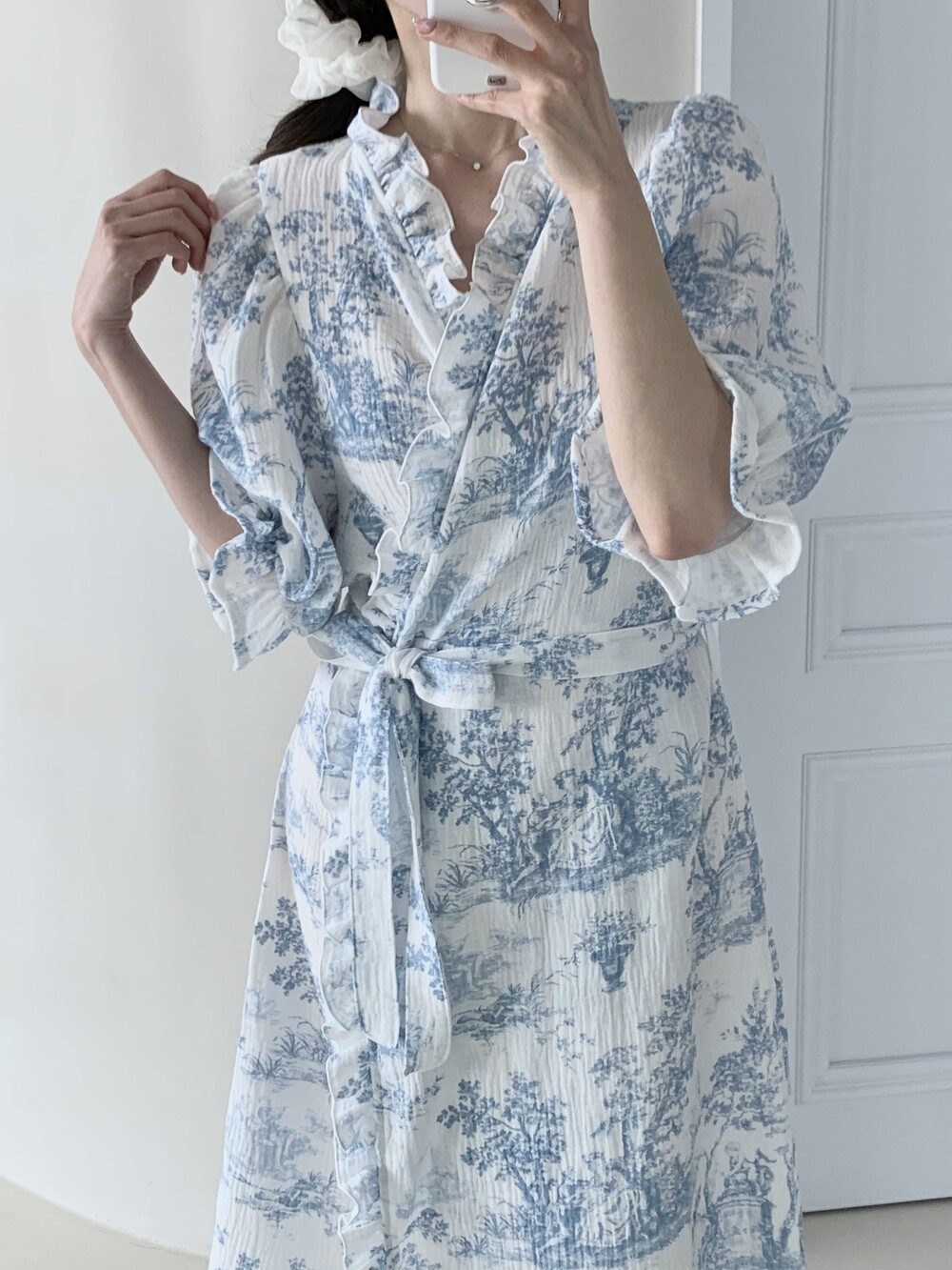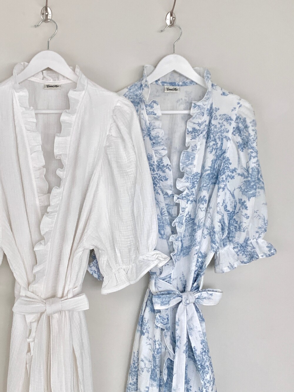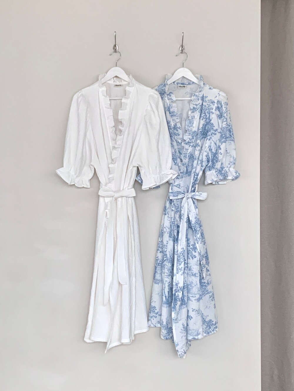 프렌치 감성의 프릴을 네크라인부터 로브 하단까지 더해 사랑스러운 분위기를 연출했습니다.