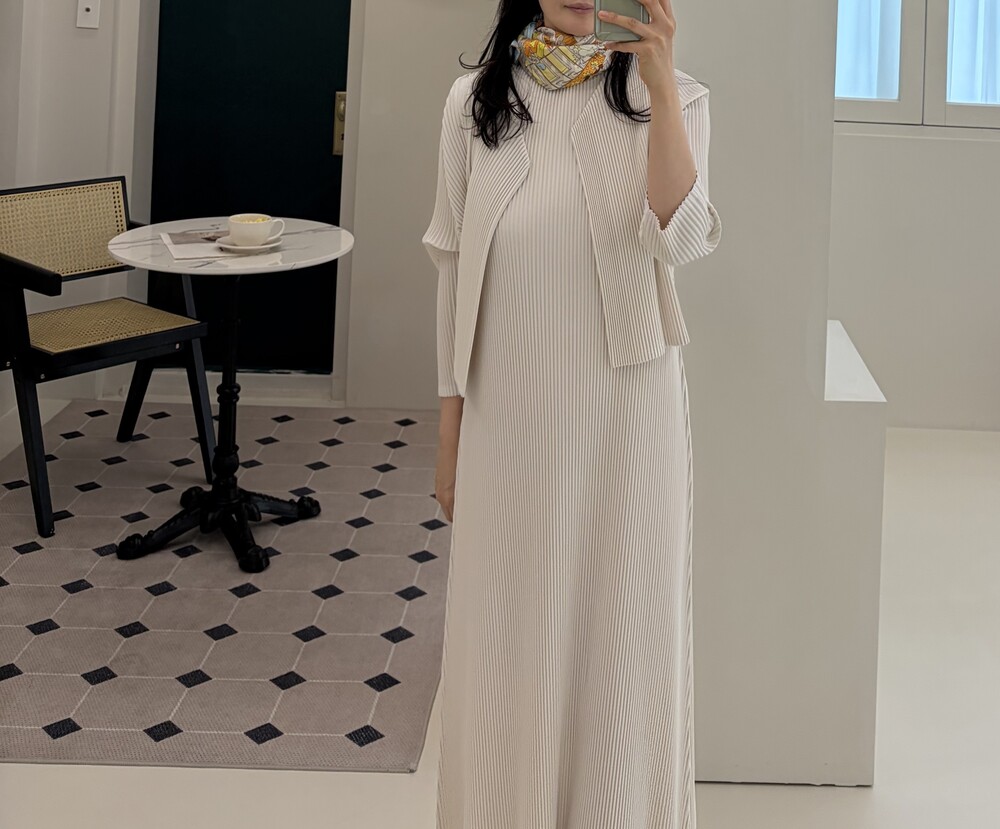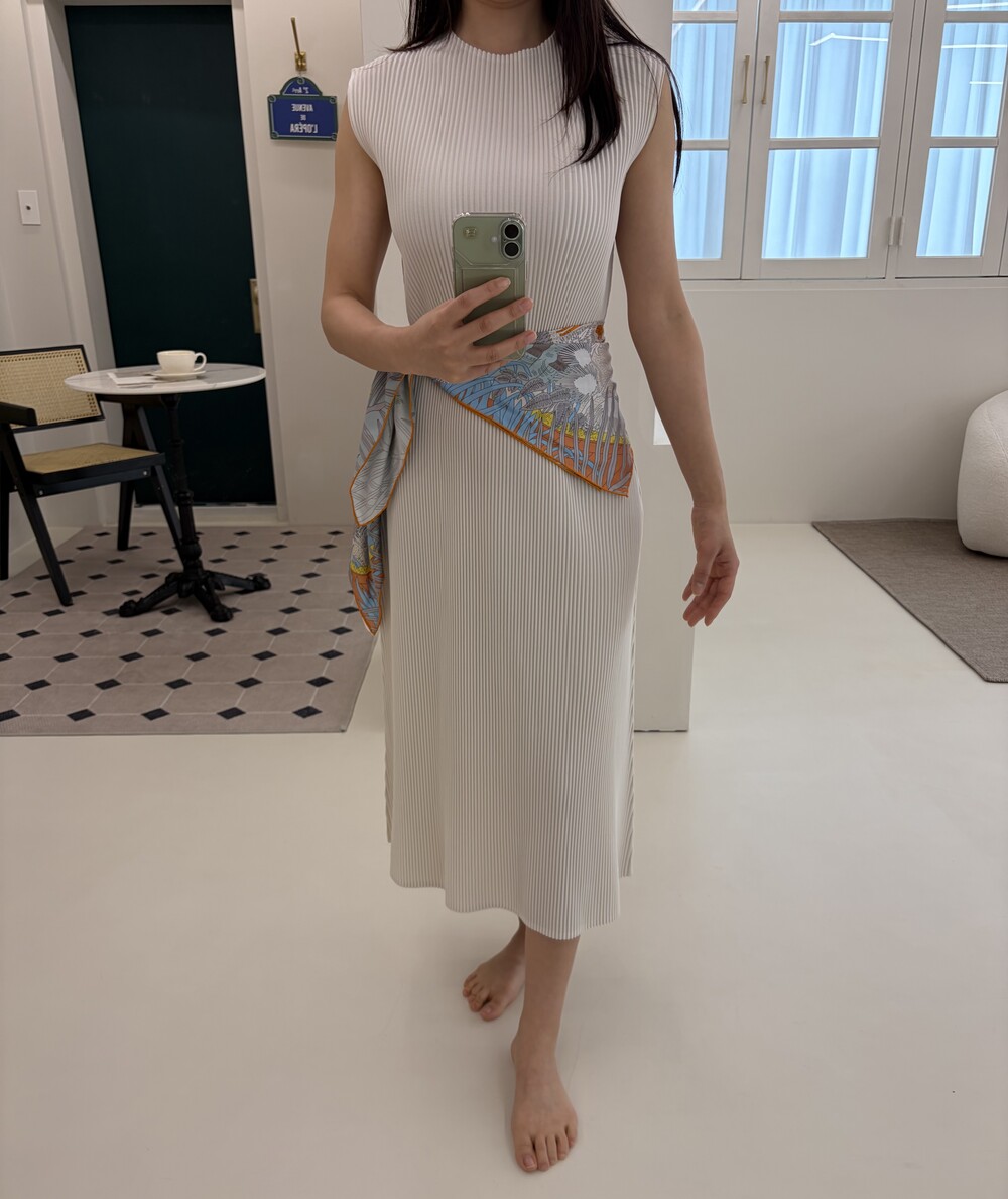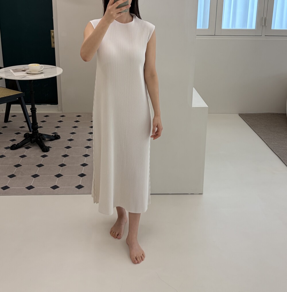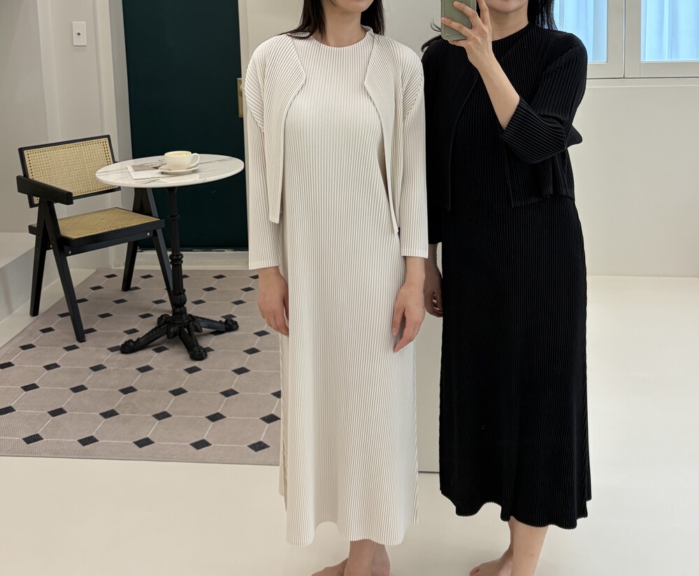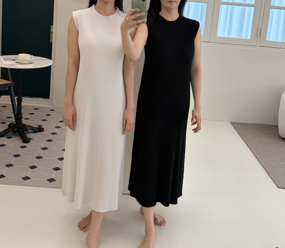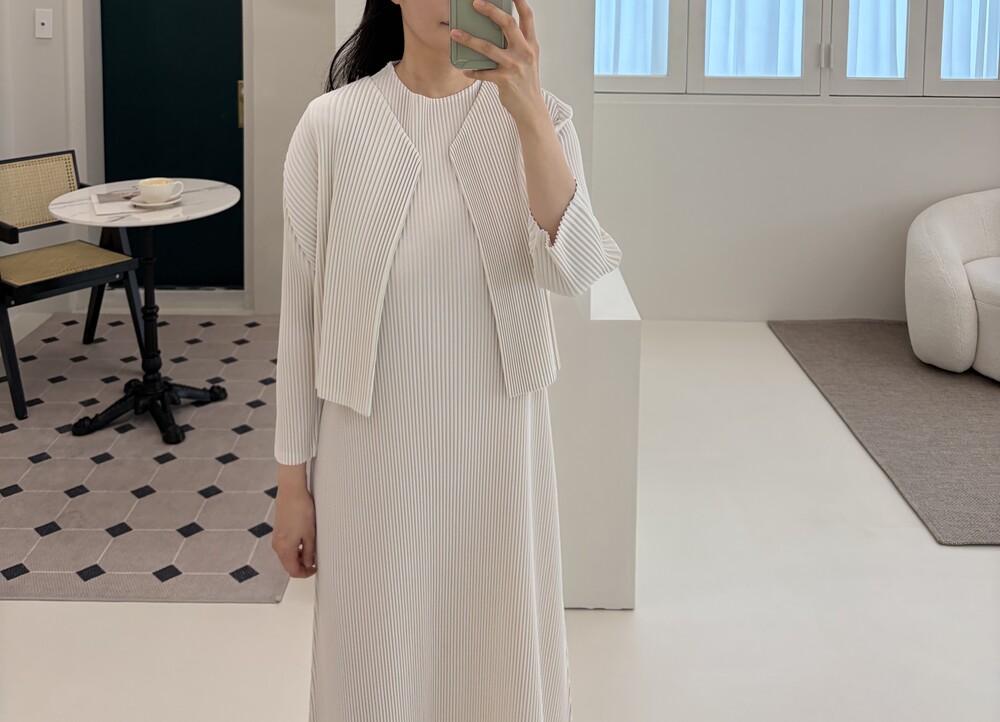 세로로 떨어지는 플리츠 텍스처가 자연스럽게 바디라인을 정돈해주며
