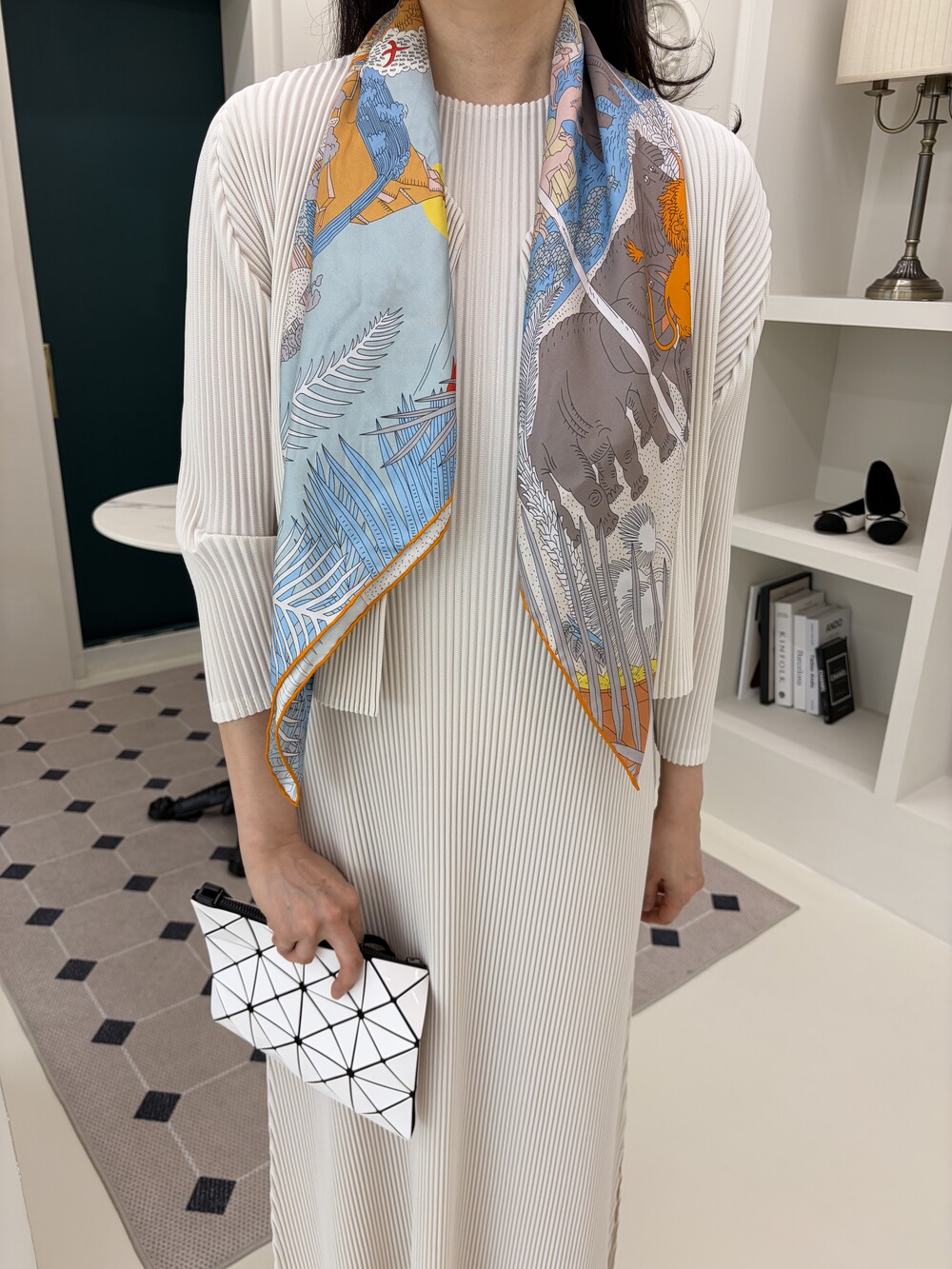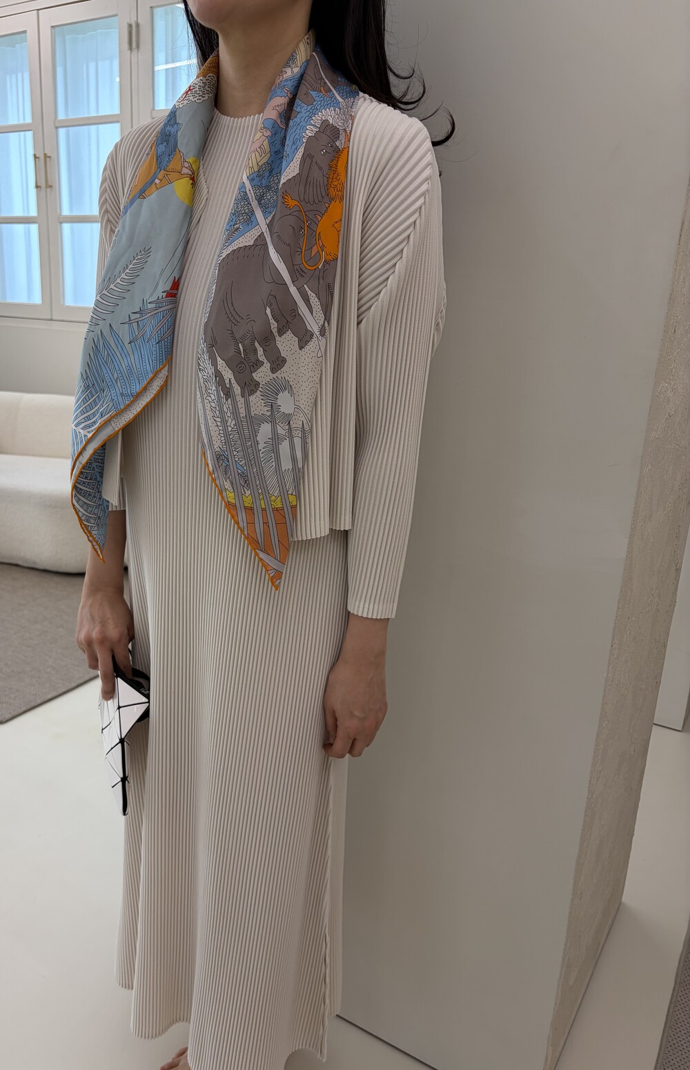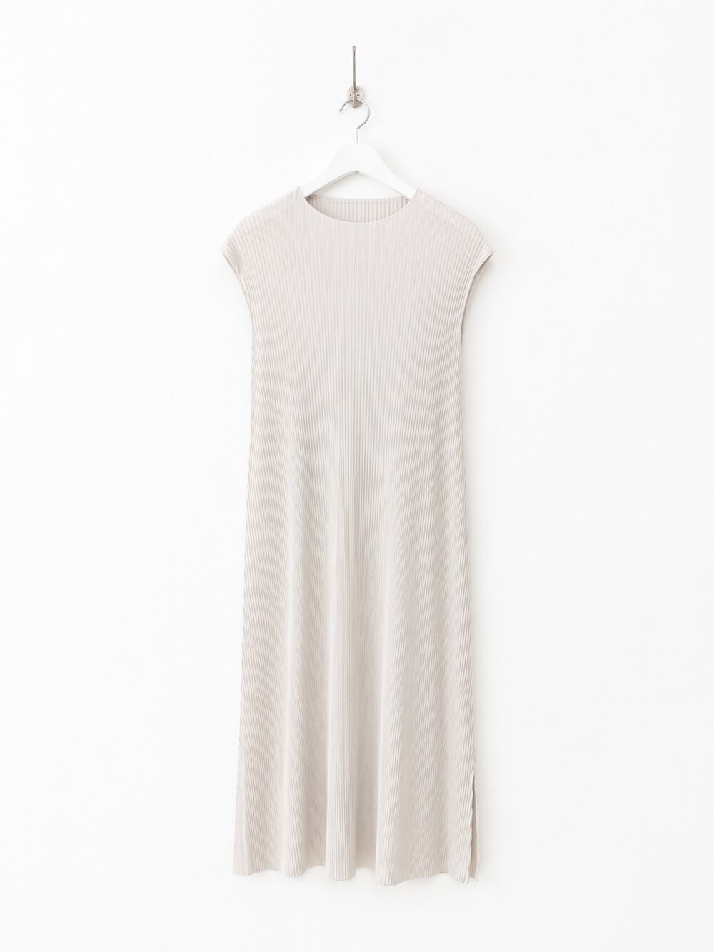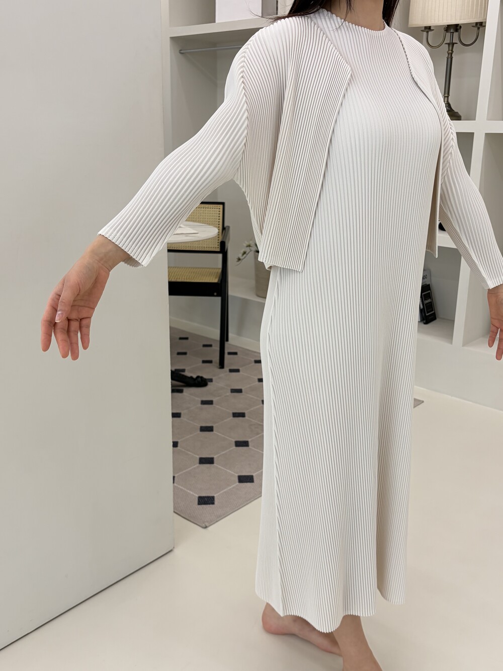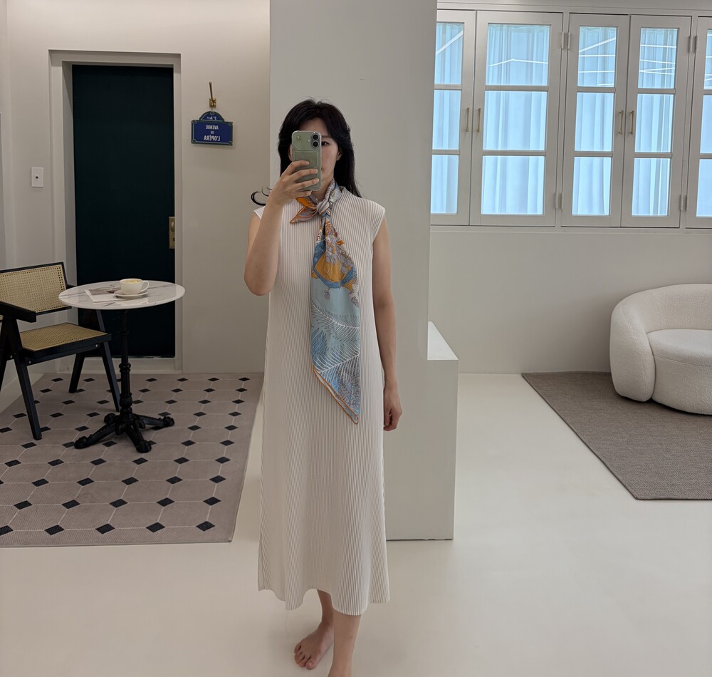 세로로 떨어지는 플리츠 텍스처가 자연스럽게 바디라인을 정돈해주며