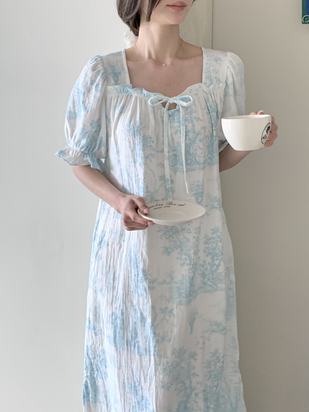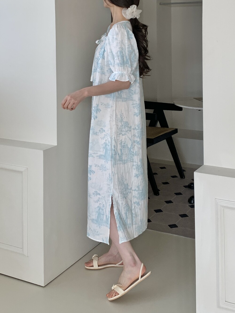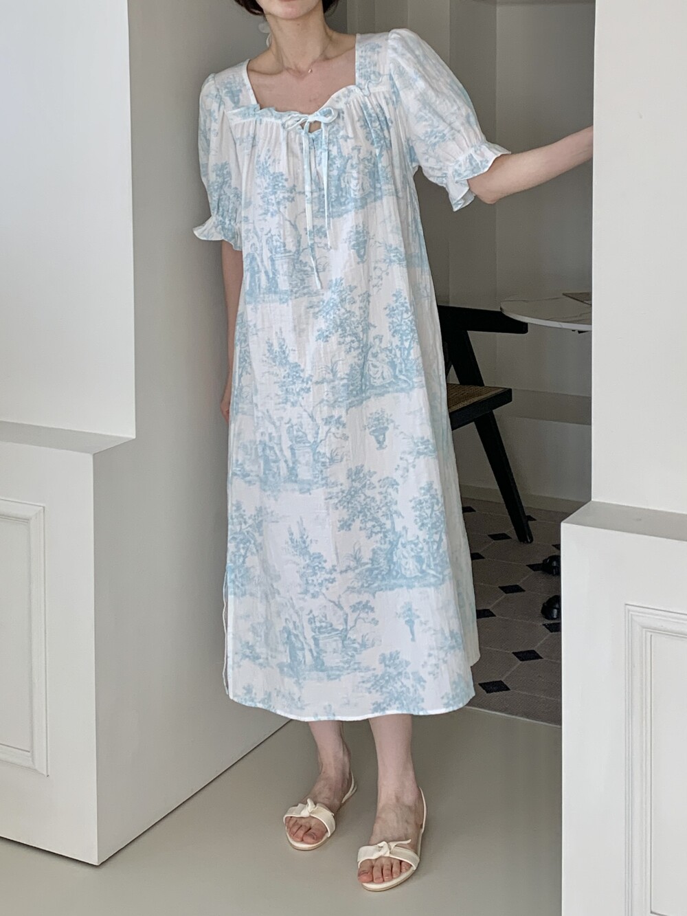 넥라인 리본 디테일과 소매 프릴 포인트는 과하지 않게 은은한 여성스러움을 더해주고,