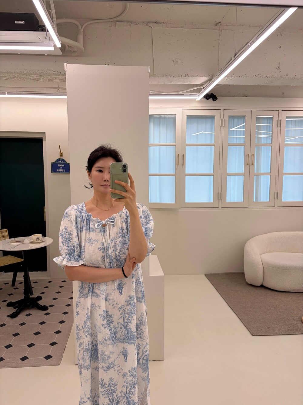 넥라인 리본 디테일과 소매 프릴 포인트는 과하지 않게 은은한 여성스러움을 더해주고,